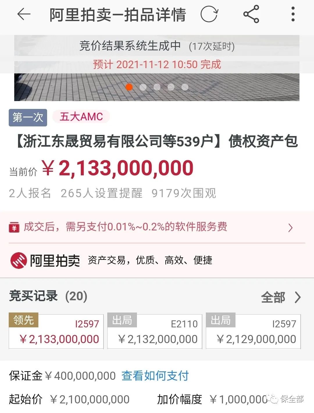 中國信達浙江省分公司在阿里拍賣平臺掛拍的本息金額合計204億元的不良資產包溢價成交,成交價21.33億元,成為網拍成交的最大金額資產包。