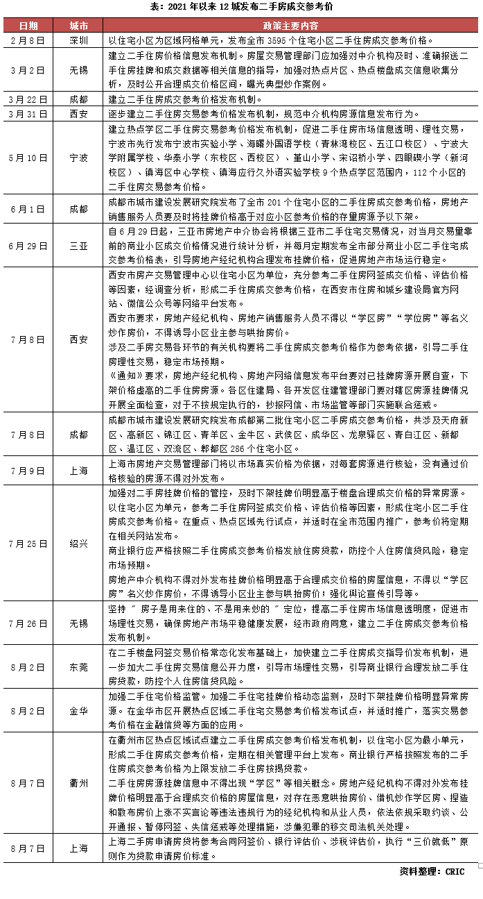 2021年以來,熱點城市紛紛加碼調控,并下沉到縣級市,地方調控趨于高頻化、精準化,根據市場過熱的實際情況,針對性采取調控政策措施,全面落實穩地價、穩房價、穩預期。其中,二手房成交參考價成為本輪調控的新舉措。