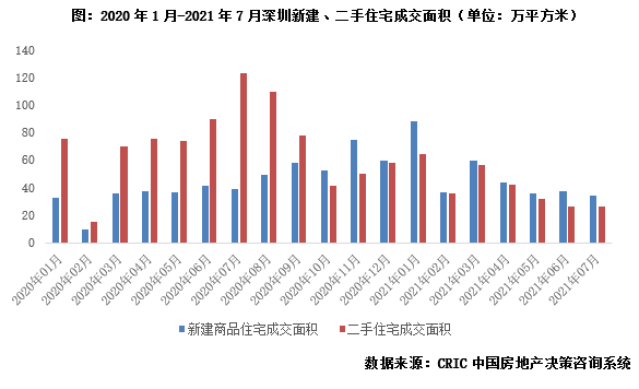2021年2月,深圳率先落地二手房成交參考價,疊加監管部門嚴打經營貸,嚴防信貸資金違規流入房地產市場。受此影響,2021年二季度以來,深圳二手房市場下行壓力加劇,成交逐月走低,6、7兩月二手住宅成交面積低至26萬平方米,再創年內新低。
