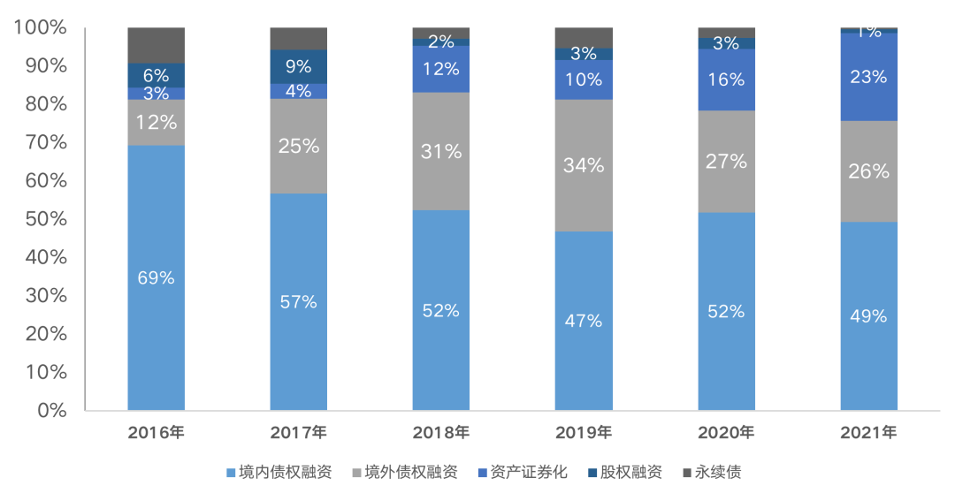 從融資結(jié)構(gòu)來看,2021年融資占比最高的仍是境內(nèi)債權(quán)融資,占比達到49%。2021年房企境內(nèi)債權(quán)融資同比下降29%至6436億元;境外債權(quán)融資量3435億元,同比下降26%;股權(quán)融資和永續(xù)債分別募集112億元和58億元,降幅較大,分別較同比下降77%和88%,在三條紅線出臺后,永續(xù)債也納入全口徑負債監(jiān)管,企業(yè)永續(xù)債發(fā)債持續(xù)下降。