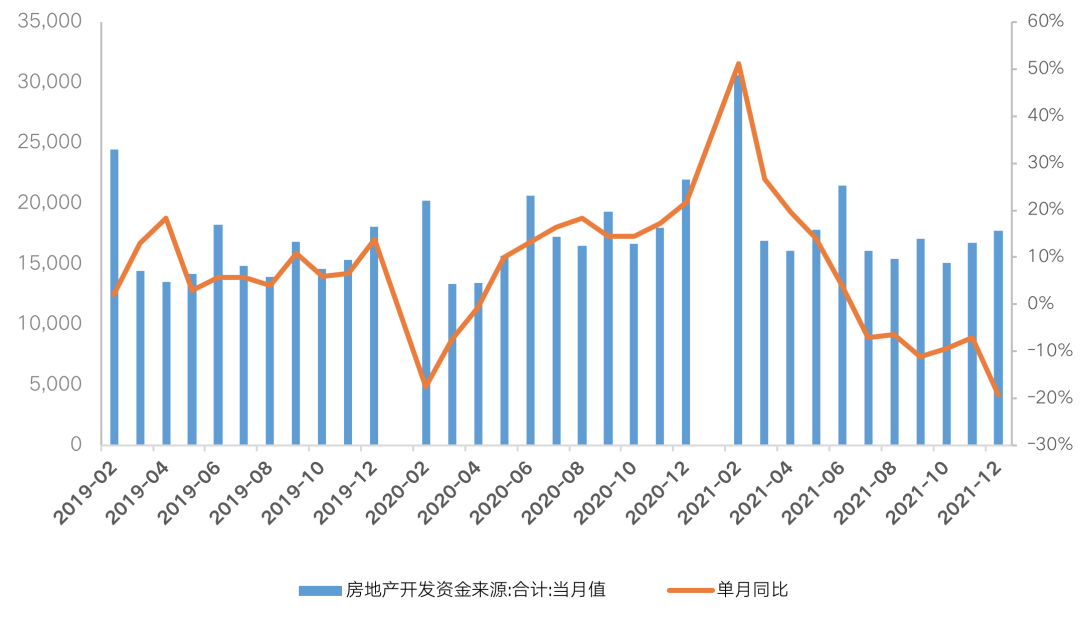 從房地產(chǎn)開發(fā)到位資金來看,2021年1-12月,房地產(chǎn)開發(fā)企業(yè)到位資金201132億元,同比增長4.2%,規(guī)模創(chuàng)歷史新高,但增速創(chuàng)近六年新低。且增速逐月下滑,下半年起到位資金單月值同比出現(xiàn)負增長,9月同比降幅達到11.2%。四季度政策密集發(fā)聲后,但年末到位資金增速仍表現(xiàn)不佳,12月單月到位資金17770億元,同比下降19.3%,單月到位資金規(guī)模低于歷史同期,同比增速創(chuàng)近五年新低。