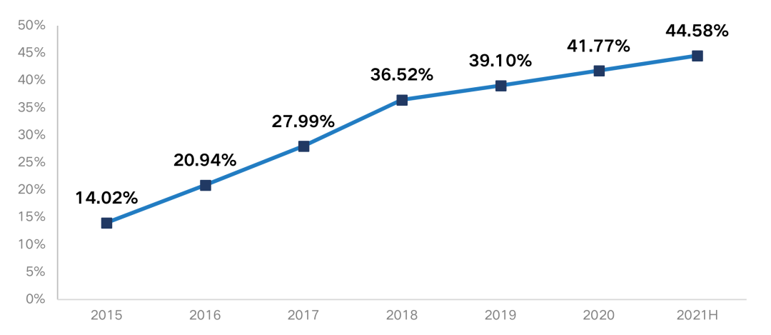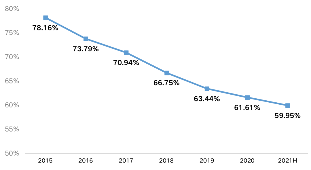 樣本房企歸母權(quán)益/總權(quán)益占比從2015年的78.16%減少至2021年中期的59.95%。少數(shù)股東權(quán)益增長過快,主要是近年來房企加大了項目的合作比例。