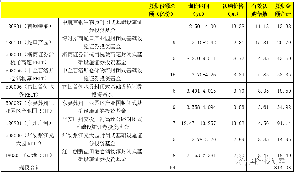 (二)從認購價格來看,最高為13.38元(中航首鋼生物質封閉式基礎設施證券投資基金)和13.02元(平安廣州交投廣河高速公路封閉式基礎設施證券投資基金),最低為2.30元(紅土創新鹽田港倉儲物流封閉式基礎設施證券投資基金)和2.31元(博時招商蛇口產業園封閉式基礎設施證券投資基金)。