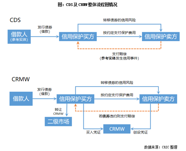 而CRMW與CDS的區別就在于CDS是合約性質,而CRMW與債券類似,有創設登記、發行銷售、交易結算、注銷等一系列流程,可在市場中流通買賣,更能起到分散市場風險的作用。此外,CDS針對的是債務發行主體,一旦其發生信用問題都納入信用保護,范圍更廣;而CRMW僅針對發債主體的某一債項,在結構上更加清晰,且可在二級市場流通。