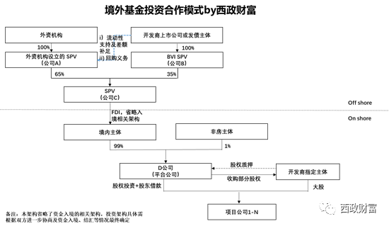 1.外資機(jī)構(gòu)境外SPV(A公司)與開(kāi)發(fā)商上市主體或發(fā)債主體設(shè)立的BVI SPV(公司B)共同按照65%:35%的比例共同出資成立公司C。