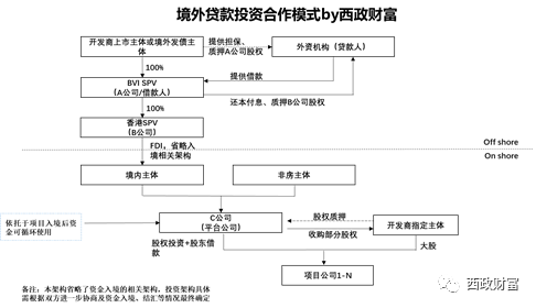 1.開(kāi)發(fā)商上市主體或境外發(fā)債主體設(shè)立BVI SPV(即A公司)作為借款人;A公司設(shè)立全資B公司并通過(guò)外商投資方式最終與境內(nèi)非房主體共同成立C公司作為平臺(tái)公司。