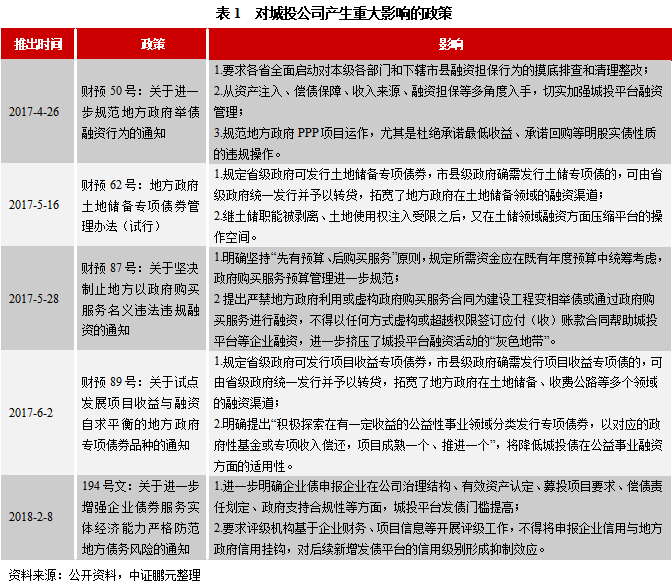 本文認為:市場各方對該段表述反應過度了。原因在于,相似的表述在2018年9月13日《關于加強國有企業(yè)資產負債約束的指導意見》(以下簡稱“《意見》”)中曾出現過。《意見》第五部分第五條明確指出:“對嚴重資不抵債失去清償能力的地方政府融資平臺公司,依法實施破產重整或清算,堅決防止‘大而不能倒”’,堅決防止風險累積形成系統(tǒng)性風險。” 事實上,從《意見》發(fā)布至今,尚未有任何一家城投公司出現過公募債券違約的情形,更不用說被依法實施破產重整或清算了。在AAA級國企“信仰”都被擊潰的情況下,城投債的“剛兌”仍然在持續(xù)。回望《意見》發(fā)布前不久已經公布的對城投公司產生重大影響的政策(見表1)可知,監(jiān)管對于城投公司的態(tài)度在更早時候已經轉為從嚴從緊,以各種方式方法來遏制因城投公司投融資行為導致的地方隱性債務是由來已久的監(jiān)管主線。因此,《意見》中提出上述較為嚴厲的監(jiān)管舉措在彼時也并不超出市場預期,兩年多之后的國發(fā)“5號文”重申這一表述則更是在預期之內。