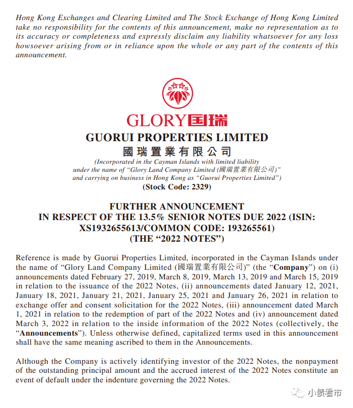 3月4日,國瑞置業(02329.HK)公告稱,盡管公司正在積極確認旗下2022年到期13.5%票據(ISIN:XS1932655613)投資者的身份,但根據本期票據的相關契約,未支付票據未償本金及應計利息已構成違約事件。