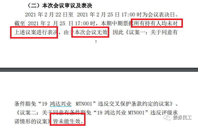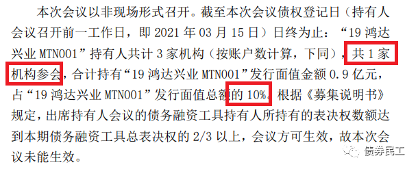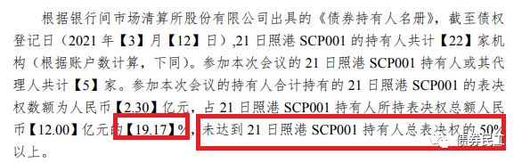 4、2021年3月16日,“”第一次持有人會議的持有人所持有的表決權數(shù)額未達到本期債務融資工具總表決權的三分之二以上,持有人會議無效。主承銷商在3月19日也公告,