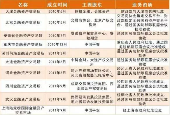 2010-2011年間,全國(guó)范圍內(nèi)出現(xiàn)了7家金交所,包括:安徽省金融資產(chǎn)交易所、重慶市金融資產(chǎn)交易所、深圳前海資產(chǎn)交易所、大連金融資產(chǎn)交易所、河北金融資產(chǎn)交易所、四川金融資產(chǎn)交易所和武漢金融資產(chǎn)交易所,全都通過了國(guó)務(wù)院清理整頓各類交易場(chǎng)所部際聯(lián)席會(huì)議驗(yàn)收。