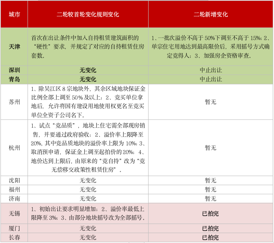 表:已發(fā)布二輪集中供地公告城市二輪供地規(guī)則變化及新增變化
