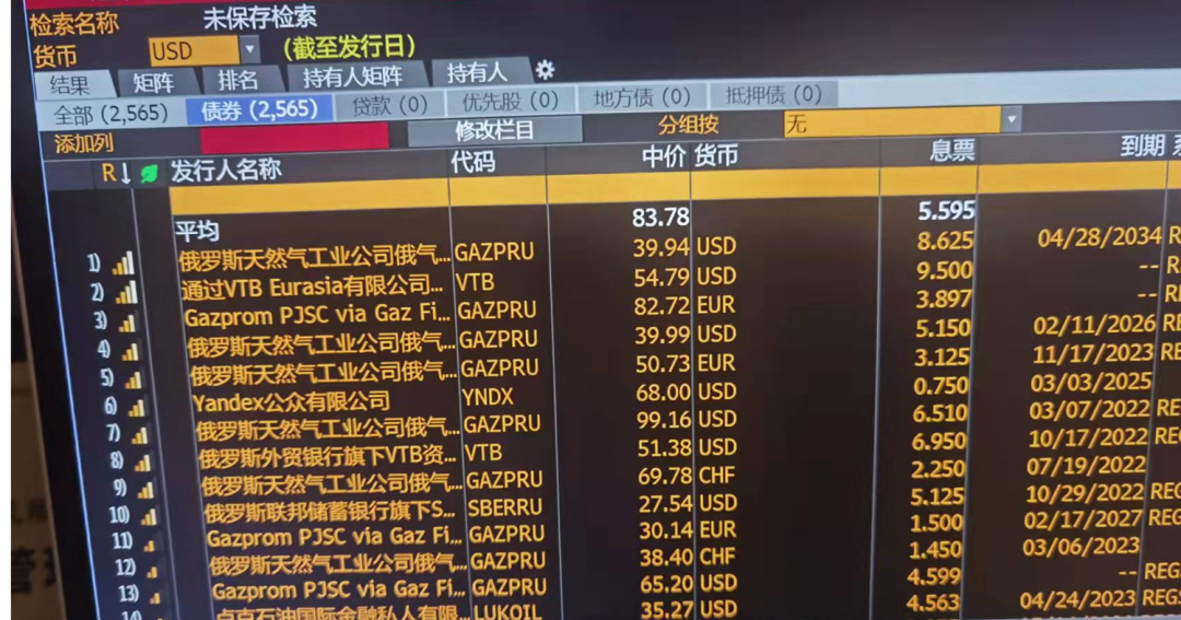隨著西方國(guó)家切斷swift連接和出口限制等一系列制裁手段的出爐,俄羅斯中石油中石化(Rosneft&Gazprom),還有俄羅斯宇宙行(Sberbank)的以美元計(jì)價(jià)的債券價(jià)格已經(jīng)下跌到30元左右的垃圾級(jí)水平。