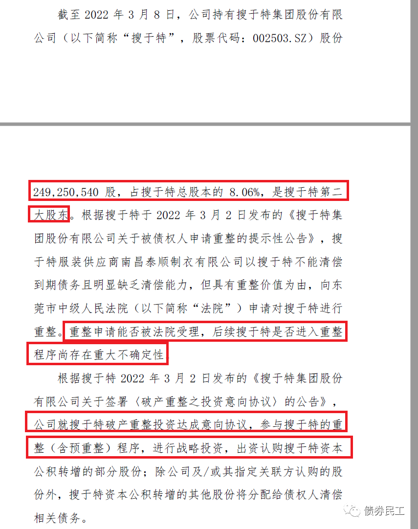 廣州高新區(qū)投資集團(tuán)有限公司就搜于特集團(tuán)股份有限公司破產(chǎn)重整投資達(dá)成意向協(xié)議,參與搜于特的重整程序,進(jìn)行戰(zhàn)略投資。