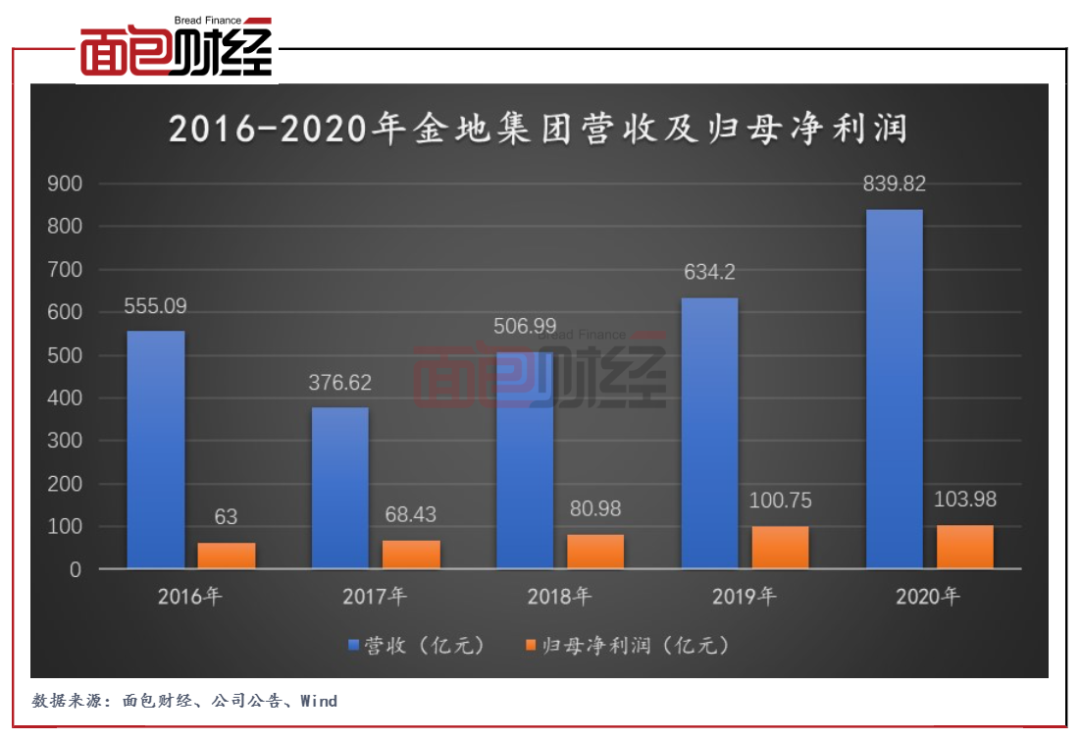 金地集團2020年年報顯示,公司當年實現營收839.8億元,同比增長32.6%;實現歸母凈利潤103.98億元,同比增長3.2%。