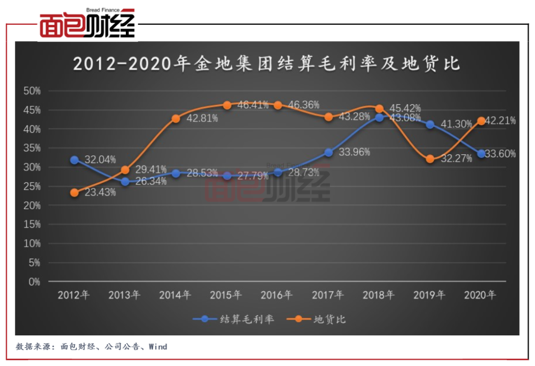 按照房地產行業的特性,結算毛利率相對來說是滯后的,從拿地毛利率兌現到結算毛利率,可能與融資成本、推盤節奏和結算結構有關。追溯金地集團過往拿地及銷售數據,自2016年開始,公司尋求銷售規模的快速增長,與之匹配的拿地儲備也全面加速。