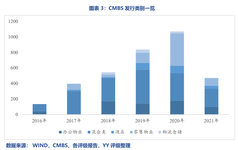 CMBS(商業(yè)地產(chǎn)抵押貸款支持證券)的特征為以商業(yè)地產(chǎn)為抵押、以相關(guān)商業(yè)地產(chǎn)未來(lái)收入(如租金、物業(yè)費(fèi)等)為償還本息來(lái)源的資產(chǎn)支持證券產(chǎn)品。其中,商業(yè)地產(chǎn)往往包括一個(gè)或多個(gè)商場(chǎng)、寫字樓、酒店、公寓等商業(yè)地產(chǎn)的抵押貸款組合。而抵押貸款支持證券意味著相比REITS并不出表,往往通過信托計(jì)劃+專項(xiàng)計(jì)劃的雙SPV結(jié)構(gòu)發(fā)行。另外,銀行間市場(chǎng)發(fā)行的稱為CMBN,現(xiàn)與CMBS大致類似,一般分類為CMBS/CMBN,下文統(tǒng)稱為CMBS。