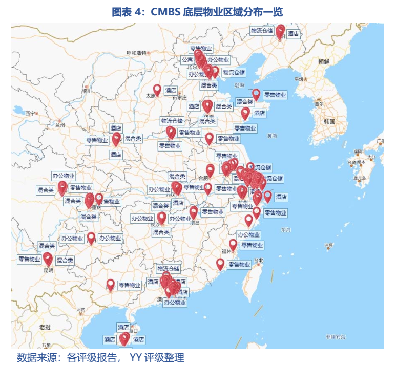 同時(shí),將包含多個(gè)資產(chǎn)的CMBS拆開后(共282個(gè)物業(yè))為混合類68個(gè)、零售物業(yè)78個(gè)、辦公物業(yè)60個(gè)、酒店37個(gè)以及物流倉(cāng)儲(chǔ)22個(gè),辦公、零售或辦公購(gòu)物綜合體的混合類仍為CMBS發(fā)行的主力。
