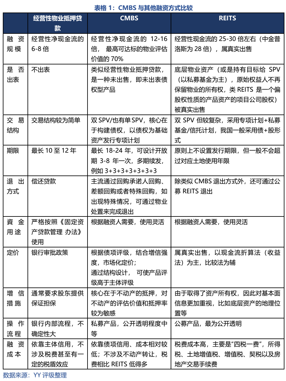 相比REITS的股性或經(jīng)營(yíng)性抵押貸款的間接融資特性,CMBS有更強(qiáng)債性。具體體現(xiàn)為相較REITS不真實(shí)出售,而相較經(jīng)營(yíng)性物業(yè)抵押貸款融資額較高、期限較長(zhǎng)、資金使用限制相對(duì)較少。