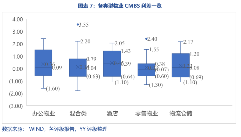 我們以A1優(yōu)先級(jí)的CMBS與主體信用利差為例,不同資產(chǎn)類型和不同城市的利差皆有不同。其中辦公物業(yè)、混合類、酒店、零售物業(yè)、物流倉(cāng)儲(chǔ)的平均利差約為36、14、45、7、22 bp;而我們只看重點(diǎn)城市北京、上海、深圳的話(多地為多地多個(gè)資產(chǎn),平均12 bp)平均利差約為22、40、40bp。綜合而言,從利差角度,市場(chǎng)對(duì)核心城市(北上深)的辦公物業(yè)、酒店、物流倉(cāng)儲(chǔ)資產(chǎn)認(rèn)可程度較好,高于總體平均利差,而混合類和零售物業(yè)類資產(chǎn)雖然占比很高但方差也較大。