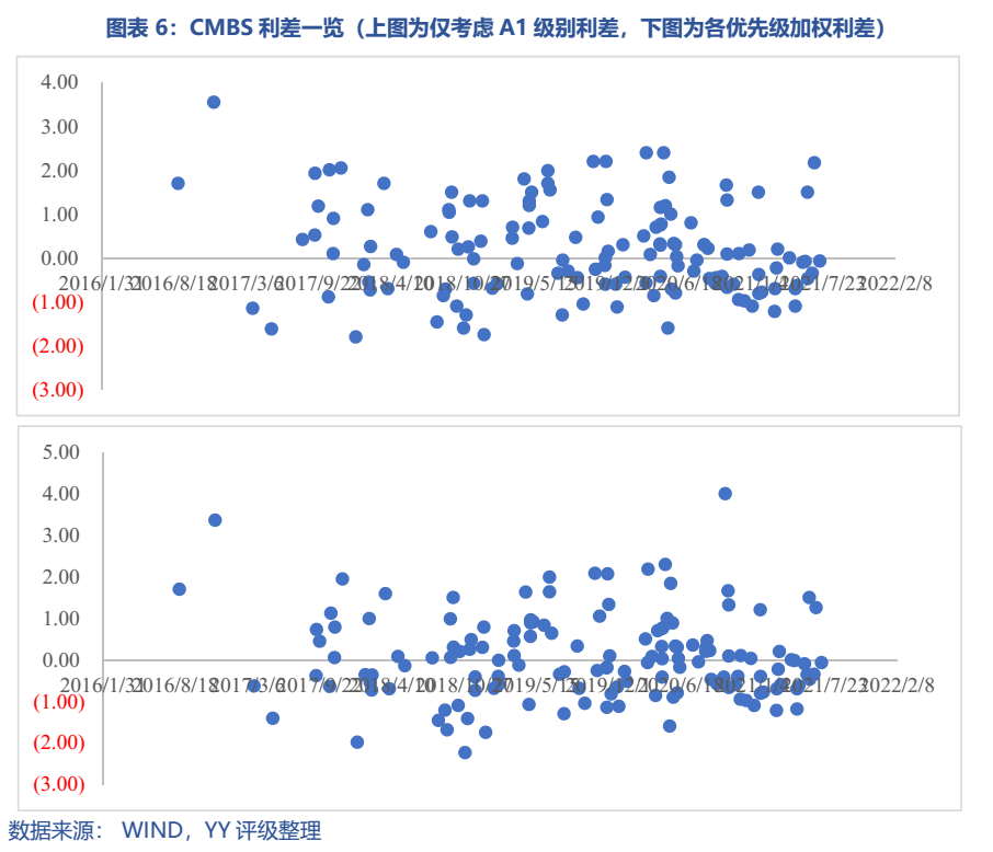 3)整體而言從利差角度認(rèn)可“商業(yè)地產(chǎn)抵押”的增信效果,尤其是對(duì)弱主體增信效果明顯。