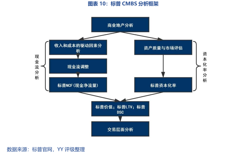 具體操作而言,標(biāo)普CMBS評(píng)級(jí)分為三個(gè)主要部分:資產(chǎn)現(xiàn)金流量分析、資本化率估計(jì)及其在估計(jì)資產(chǎn)價(jià)值中的用途、以及與資產(chǎn)分析相關(guān)的分析指標(biāo)和其他考慮因素。大致的流程如圖12所示,標(biāo)普會(huì)先通過收入和成本的驅(qū)動(dòng)因素分析+對(duì)特殊或與市場(chǎng)情況有一定距離的情況進(jìn)行調(diào)整以得到預(yù)期現(xiàn)金流,再通過資產(chǎn)質(zhì)量與市場(chǎng)評(píng)估得到資本化率的估計(jì),進(jìn)而得到1)標(biāo)普價(jià)值=標(biāo)普NCF/標(biāo)普資本化率;2)標(biāo)普DSC=標(biāo)普NCF/本息支付;3)標(biāo)普LTV=貸款余額/標(biāo)普價(jià)值。以上三個(gè)指標(biāo)再在交易層面結(jié)合壓力測(cè)試和資產(chǎn)多樣性指標(biāo),以確定每個(gè)不同法律、環(huán)境背景下的區(qū)域的不同CMBS交易的信用風(fēng)險(xiǎn)和最終增信級(jí)別。