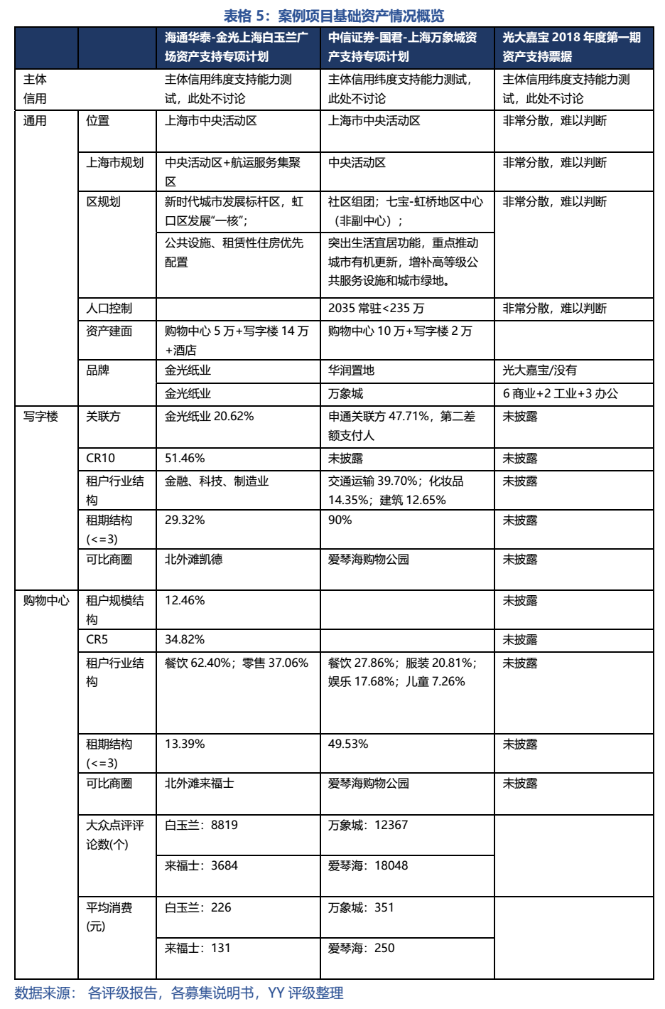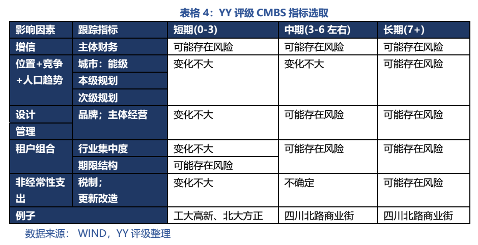 概括而言,表4的指標(biāo)設(shè)計(jì)成維度定性跟蹤指標(biāo),即主體財(cái)務(wù)以反映增信風(fēng)險(xiǎn)、主體經(jīng)營(yíng)(品牌)以反映設(shè)計(jì)和管理風(fēng)險(xiǎn)、各級(jí)城市規(guī)劃也反映位置+競(jìng)爭(zhēng)+人口趨勢(shì)問題以及用行業(yè)分布、期限結(jié)構(gòu)來(lái)跟蹤租戶組合風(fēng)險(xiǎn),同時(shí)關(guān)注一些可能的非經(jīng)常性支出問題,如稅制改革(房地產(chǎn)稅)和更新改造需求(五角場(chǎng)萬(wàn)達(dá)為10年左右后改造)。