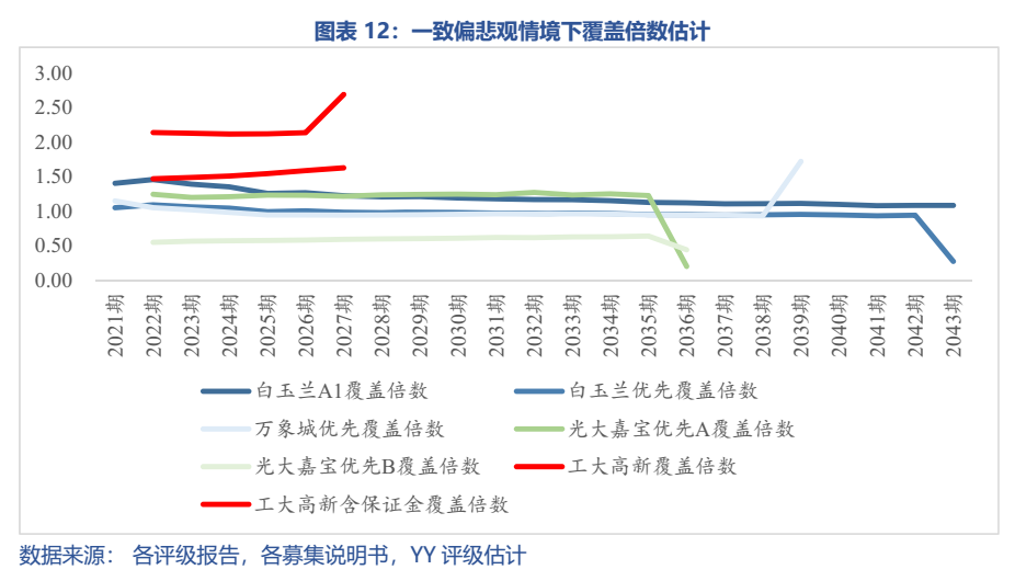如圖14可見,在租金和出租率都偏悲觀(樂觀不消說(shuō)除最后一期外都是足額的)的情況下,白玉蘭對(duì)A1級(jí)本息覆蓋倍數(shù)也一直保持在1以上,2027年開始對(duì)優(yōu)先A2級(jí)利息覆蓋不足,但也在0.95以上,但無(wú)法保障A2級(jí)本金償還;萬(wàn)象城只有一層優(yōu)先級(jí),悲觀預(yù)期下2024年開始優(yōu)先級(jí)本息覆蓋倍數(shù)小于1,但也一直處于0.9以上;光大嘉寶對(duì)優(yōu)先A級(jí)保障程度較好,但對(duì)優(yōu)先B級(jí)幾乎肯定無(wú)法覆蓋本息,必然依賴主體信用;工大高新在考慮不考慮保證金的情況下覆蓋倍數(shù)都較好,考慮保證金的情況下覆蓋倍數(shù)更是達(dá)到了2左右。