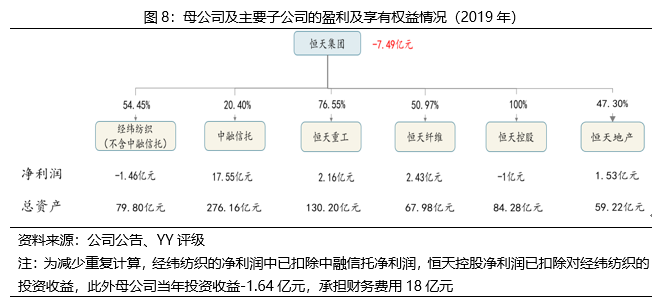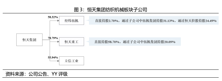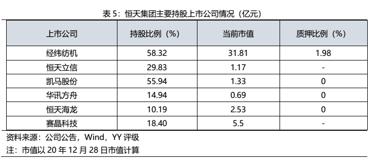 恒天集團屬于控股型公司,旗下子公司眾多,境內外控股上市公司3家,分別是A股上市公司經緯紡機(持股比例58.32%)、B股上市公司凱馬股份(持股比例31.60%)和H股上市公司恒天立信(持股比例55.94%);參股上市公司華訊方舟(持股14.94%)、恒天海龍(持股10.19%)、賽晶科技(持股18.56%)。公司還是中融國際信托有限公司的大股東。除母公司外,經緯紡機和中融信托也作為發債主體獨立發債。