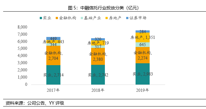 從行業投向來看,主要投向為實業和金融機構,至2019年末分別占比39.0%、29.7%。另外,投向房地產行業的占比2019年也快速提升,達到17.7%。