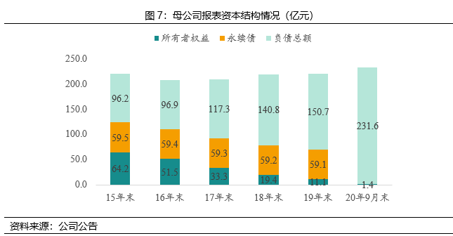 雖然資產規模變化不大,但由于歸母凈利潤持續虧損,資本結構上發生了巨大的變化,所有者權益急劇縮水,而負債規模大幅攀升。15年末至20年9月末期間,由于持續虧損,母公司報表所有者權益(不含永續債)從64.2億元縮水至1.4億元,同時20年下半年2只“5+N”的永續債到期(若不償還則利率跳升300BP),合計約60億元。負債總額(不含永續債)期間從96.2億元增長至231.6億元,其中有息債務從80.4億元增長至154.7億元。另外,20年三季度在永續債減少的同時,其他應付款增加了約50億元,而合并報表其他應付款變動不大,推測是母公司占用了子公司款項以應對永續債到期。