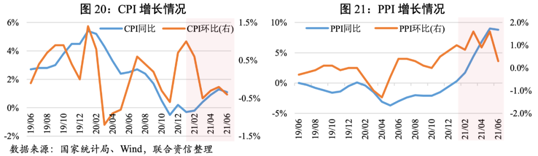 CPI方面,預(yù)計(jì)年內(nèi)CPI整體溫和上漲。食品方面,夏糧豐收使得糧食價(jià)格有望繼續(xù)保持穩(wěn)定;豬肉價(jià)格在中央和地方啟動(dòng)豬肉儲(chǔ)備收儲(chǔ)工作下有一定的支撐,豬肉價(jià)格有望保持穩(wěn)定態(tài)勢(shì)。食品價(jià)格在糧食豐收、豬肉價(jià)格保持穩(wěn)定的情況下,總體上漲壓力不大。服務(wù)價(jià)格方面,今年上半年服務(wù)價(jià)格持續(xù)受到局部疫情反復(fù)的影響,目前處于近年來的低位。隨著疫苗接種范圍不斷擴(kuò)大,疫情影響不斷減弱,餐飲、住宿、旅游的等服務(wù)消費(fèi)需求持續(xù)恢復(fù),居民服務(wù)性消費(fèi)支出不斷改善,服務(wù)價(jià)格或?qū)⑿》厣?/p>