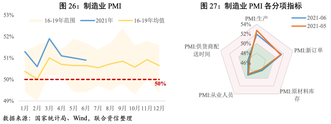 2021年上半年制造業(yè)PMI運(yùn)行在51%左右,制造業(yè)生產(chǎn)擴(kuò)張整體穩(wěn)定。6月制造業(yè)PMI微降0.10個(gè)百分點(diǎn)至50.90%,制造業(yè)景氣有所回落。生產(chǎn)指數(shù)較上月回落,但仍位于榮枯線以上,主要是近期部分企業(yè)生產(chǎn)活動(dòng)受到芯片、煤炭、電力供應(yīng)緊張以及設(shè)備檢修等因素影響,生產(chǎn)擴(kuò)張有所放緩;新訂單指數(shù)也位于榮枯線以上,且較上月小幅上升0.2個(gè)百分點(diǎn),反映出市場(chǎng)需求保持增長(zhǎng)。