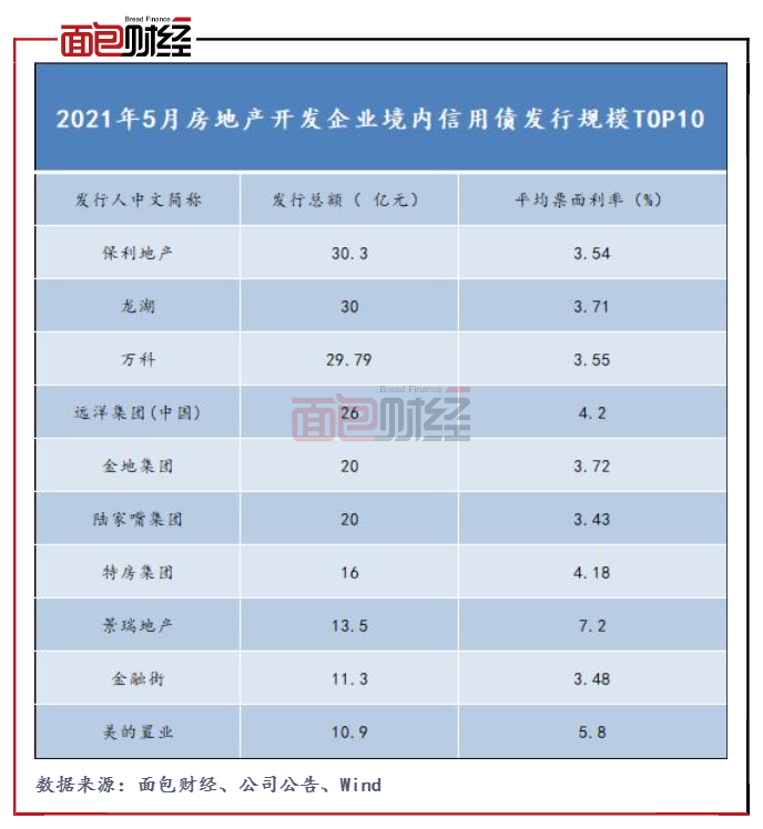 根據Wind數據,2021年5月,在新發行境內信用債的房企中,保利地產發行信用債融資最多,金額為30.3億元,平均票面利率為3.54%;其次為龍湖集團,融資金額為30億元,平均票面利率為3.71%。
