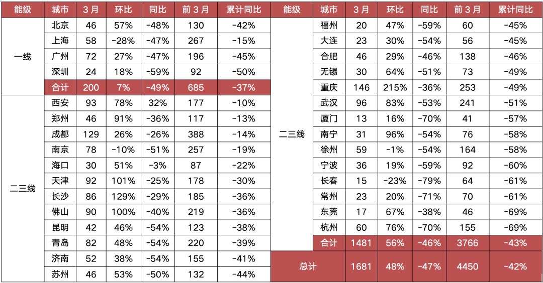 26個二三線城市整體成交面積1481萬平方米,環比增長56%,同比下降46%。一季度26個城市成交累計同比下降43%,較前2月(累計同比下降41%)降幅擴大2pcts。城市間分化持續加劇,西安、鄭州、成都和南京一季度累計同比降幅已收窄至20%已下,而武漢、南寧、長春等一季度累計仍同比下降超50%。