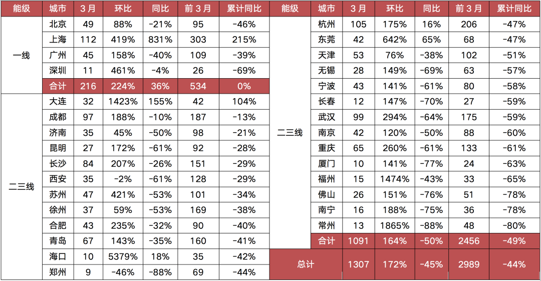 4個一線城市成交面積200萬平方米,環比微增7%,同比降49%,累計同比降37%。北京、廣州和深圳隨著新增供應入市成交開始放量,環比漲幅分別為57%、27%和18%。上海3月多盤加推,疫情突發疊加外圍項目緩慢去化,使得成交環比回落28%。