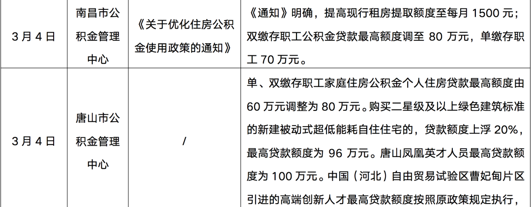 其一,南昌、中山、唐山等放松公積金貸款,例如南昌提高公積金貸款最高額度,雙繳存職工調至80萬元,單繳存職工70萬元。