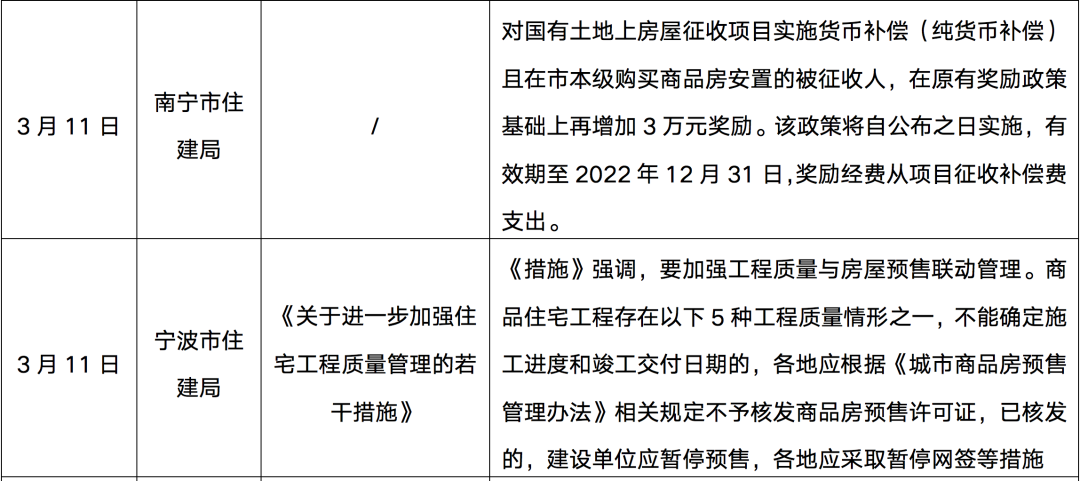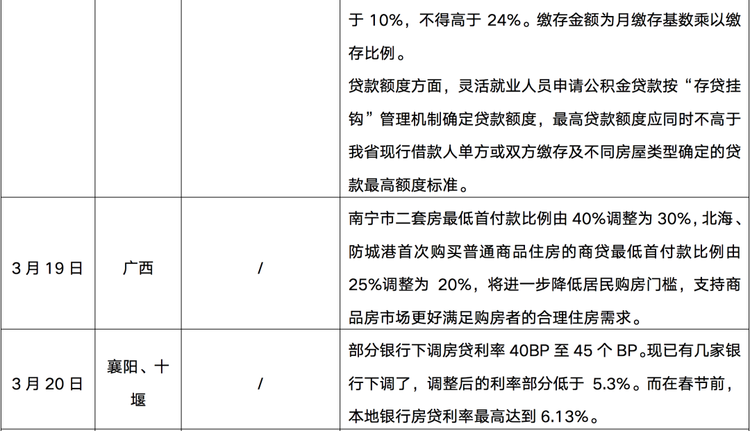 另一方面,隨著3月兩會召開,從中央五部委發聲穩定房地產,到各級地方政府出臺包括降首付、擴大公積金、降房貸利率等一系列利好措施,都在為整體市場釋放積極信號,房企從推盤到開工的信心正在逐步恢復。