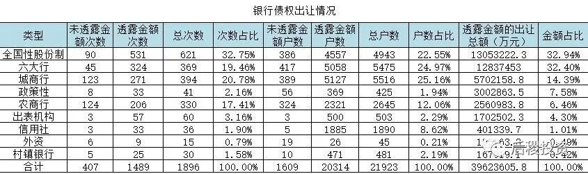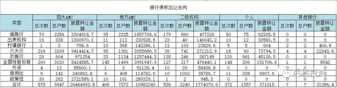 從出讓去向上看,四大AMC和地方AMC的總次數和總戶數相近,但總金額上,四大AMC占了將近70%,這是因為四大跟國有六大行的業務聯系更密切,而自然人和二級機構雖然也從銀行直接受讓債權,但因監管原因通常以單戶債權為主,故總金額占比較小。銀行出讓至四大AMC的債權總額為2646億,出讓至地方AMC的債權總額為1098億元,由此推測出目前四大AMC和地方AMC在銀行債權出讓一級市場的受讓比例大約為7:3。