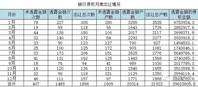 除1月外,銀行月度出讓次數曲線的區間為94-206次,區間中值為150次左右,戶數區間為827-2776戶,區間中值為1800戶左右,而月度出讓成交金額的區間中值則為350億元左右。1月和7月是公告成交的高峰期,這與業務規律也契合。
