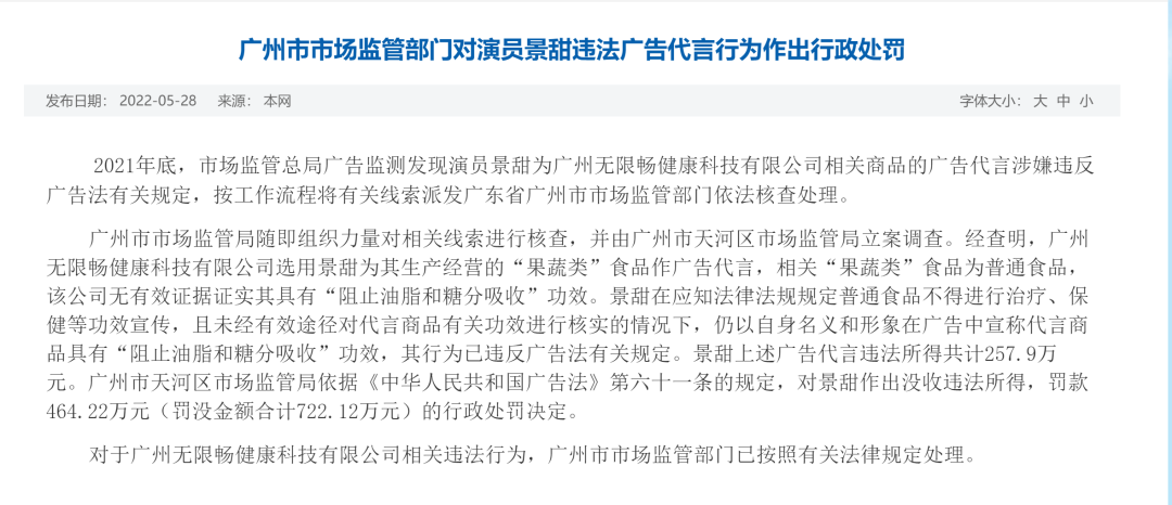 根據(jù)廣州市市場監(jiān)督管理局官網(wǎng),2022年5月28日,廣州無限暢健康科技有限公司選用景甜為其生產(chǎn)經(jīng)營的“果蔬類”食品作廣告代言,相關(guān)“果蔬類”食品為普通食品,該公司無有效證據(jù)證實(shí)其具有“阻止油脂和糖分吸收”功效。景甜在應(yīng)知法律法規(guī)規(guī)定普通食品不得進(jìn)行治療、保健等功效宣傳,且未經(jīng)有效途徑對代言商品有關(guān)功效進(jìn)行核實(shí)的情況下,仍以自身名義和形象在廣告中宣稱代言商品具有“阻止油脂和糖分吸收”功效,其行為已違反廣告法有關(guān)規(guī)定。景甜上述廣告代言違法所得共計(jì)257.9萬元。廣州市天河區(qū)市場監(jiān)管局依據(jù)《中華人民共和國廣告法》第六十一條的規(guī)定,對景甜作出沒收違法所得,罰款464.22萬元(罰沒金額合計(jì)722.12萬元)的行政處罰決定。
