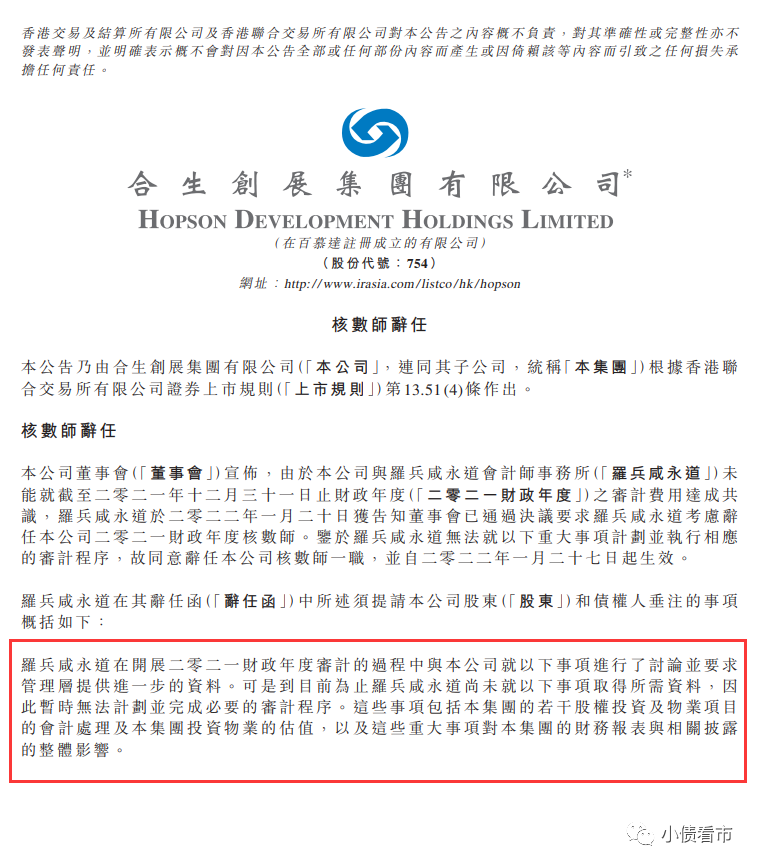 值得注意的是,除了提到與會計師事務所在費用上存在分歧之外,合生創展還稱未按照前任審計師要求提供信息。