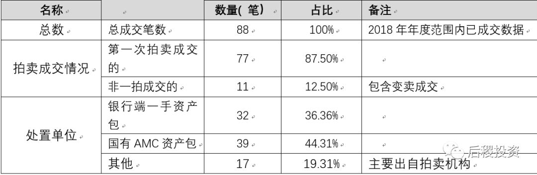由于不良資產交易的成交價很難從公開渠道獲取,且年度交易量龐大,現篩選淘寶司法拍賣中的已成交的債權交易記錄,2018年年度有效的債權交易記錄共計88筆,其中福建地區債權包一拍77筆,成交率87.5%;資產包來自銀行端的占比37.5%,來自持牌AMC的占比43.18%