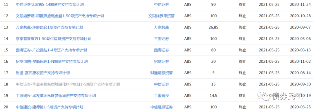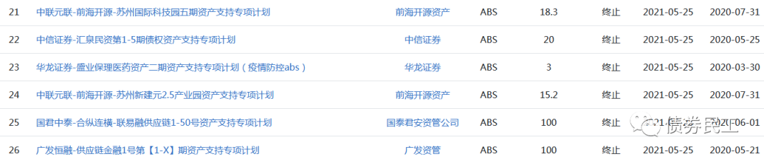 從本次終止的ABS的產(chǎn)品類型來看,包括供應(yīng)鏈金融資產(chǎn)證券化產(chǎn)品、保理資產(chǎn)證券化產(chǎn)品、PPP項(xiàng)目資產(chǎn)證券化產(chǎn)品、疫情防控ABS等各種類型的資產(chǎn)證券化產(chǎn)品。