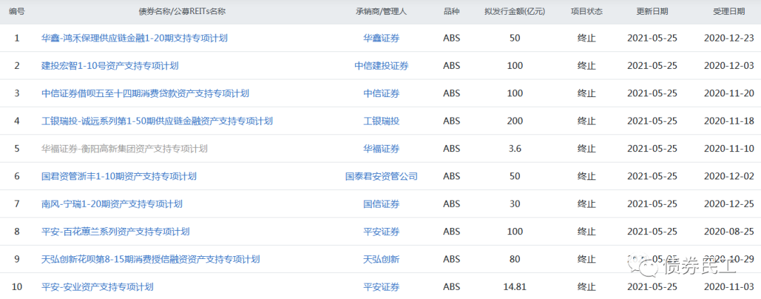 從本次終止的ABS產(chǎn)品規(guī)模來看,終止產(chǎn)品金額最大的為200億元,為工銀瑞投-誠遠(yuǎn)系列第1-50期供應(yīng)鏈金融資產(chǎn)支持專項(xiàng)計(jì)劃;終止產(chǎn)品金額最小的為3億元,為華龍證券-盛業(yè)保理醫(yī)藥資產(chǎn)二期資產(chǎn)支持專項(xiàng)計(jì)劃(疫情防控abs)。從本次終止的ABS產(chǎn)品審核時(shí)間來看,審核周期最長的項(xiàng)目已經(jīng)超過一年,比如國海證券-廣投遠(yuǎn)航1-4號(hào)資產(chǎn)支持專項(xiàng)計(jì)劃是在2020年3月13日申報(bào)的;審核周期最短的項(xiàng)目5個(gè)月,比如南風(fēng)-寧瑞1-20期資產(chǎn)支持專項(xiàng)計(jì)劃是在2020年12月25日申報(bào)的。