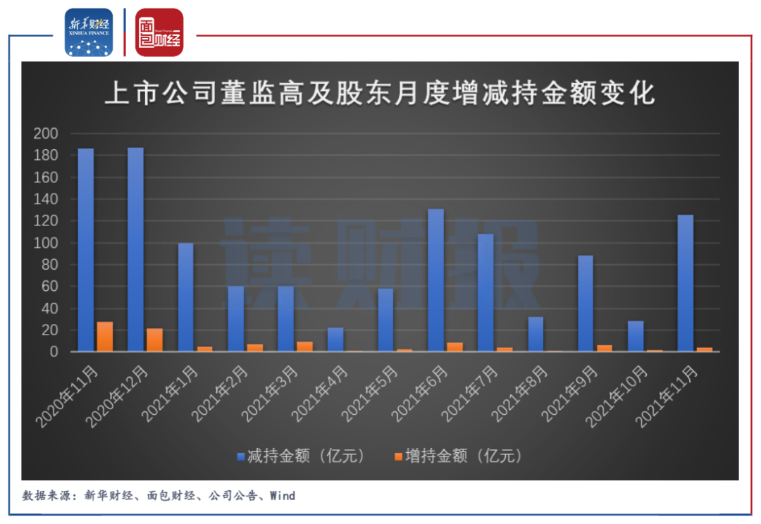 2021年11月,滬深兩市上市公司董監(jiān)高及其關(guān)聯(lián)人減持金額合計(jì)約125.68億元,涉及351家公司。