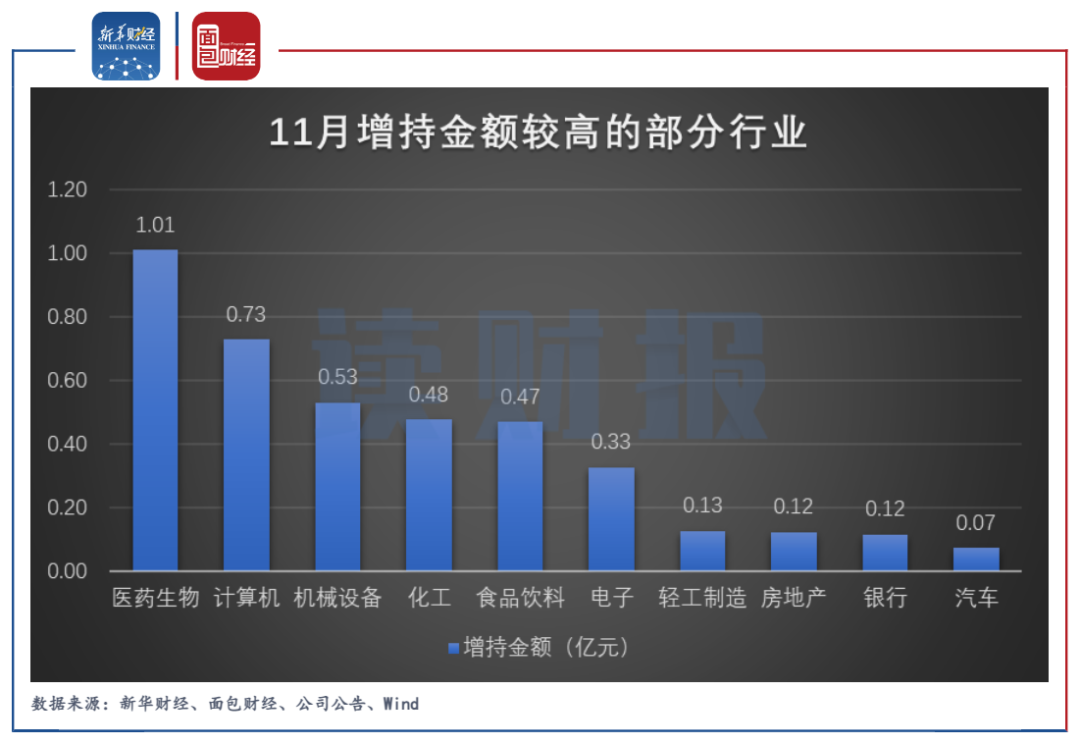 11月,各行業(yè)中機(jī)械設(shè)備減持金額居首位,醫(yī)藥生物增持金額最多。