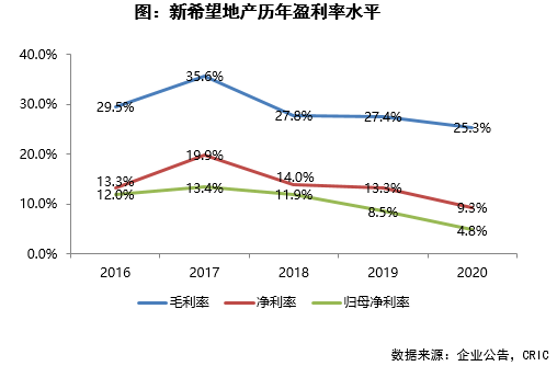 2020年新希望地產毛利率25.3%、凈利率9.3%、歸母凈利率4.8%,分別同比下降了2.1、4.0、3.7個百分點。主要在于新希望重點深耕一二線城市,這些城市的限價政策對新希望地產項目利潤造成一定的擠壓,加上合作項目的增多,對項目的成本管控方面存在一定的不確定性,對利潤率造成一定的影響。