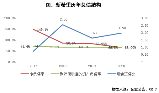 2020年新希望地產持續(xù)保證較高的回款率,銷售回款率達到90%,得益于此,2020年末,新希望地產持有現(xiàn)金150.91億元,同比上升14.2%,現(xiàn)金短債比1.98,短期內償債壓力較小;長短債比3.78,同比增長0.5,債務結構健康。