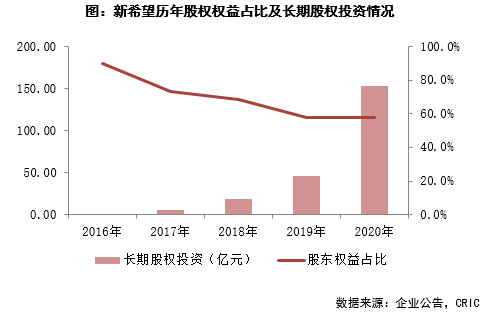 另一方面,銷售的增長還得益于新希望地產自2018年以來在拿地方面比較積極,且持續(xù)加大與其他房企的合作。2020年新希望地產新增土地總價的73%都在二線城市,在蘇州、南京、杭州等城市積極補充土儲。與此同時,新希望地產的合作力度持續(xù)較大,與萬科、融創(chuàng)、保利、融信等大型房企,建立了長期的合作關系,可以通過多元合作拿地從而實現(xiàn)風險分散,同時學習這些大型房企的產品打造及運營管理經驗,2020年新希望銷售金額權益比為52%。同時可以看到,2020年新希望的長期股權投資152.92億元,同比增長233.0%,四年復合增長率達到191%,通過合作開發(fā),在降低拿地風險的同時,也促進新希望地產銷售規(guī)模實現(xiàn)較大的飛躍。
