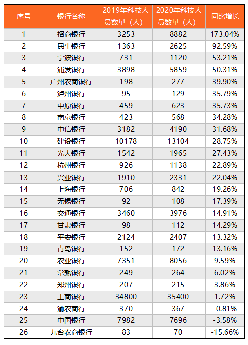 在26家銀行中,有23家科技人員數(shù)量出現(xiàn)增長,同比增長最快的是招商銀行,同比增長173.04%,科技人員數(shù)量將近翻了兩倍,此外民生銀行、寧波銀行、浦發(fā)銀行的增長率均超過50%。三家銀行出現(xiàn)同比下降,分別為渝農(nóng)商行、中國銀行和九臺(tái)農(nóng)商銀行,其中中國銀行科技人員減少286人。
